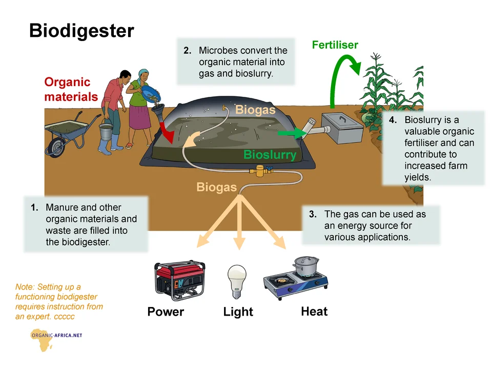 Manure can also be used in a biodigester. Biogas digesters transform manure and other organic materials such, as most foods and plant residues, into gas and bioslurry. The gas can be used as energy for cooking or other domestic uses, and bioslurry is another product that can be used as a fertilizer. Bioslurry is often even superior to farmyard manure. It usually has a more balanced nutrient composition compared to farmyard manure, and it contains nitrogen (N), phosphorus (P), potassium (K), and other micronutrients in forms that are more readily available to plants.