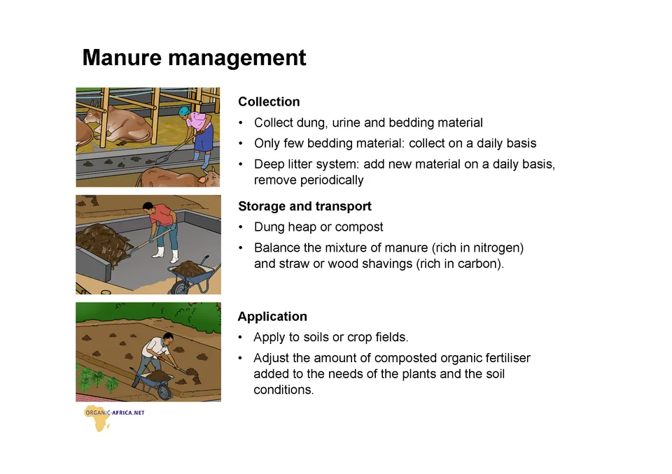 Farmyard manure is a highly valuable source of nutrients to crops and can contribute to soil fertility. Cattle manure mixed with litter material, harvest residues and feed leftovers can be composted to make a highly valuable soil amendment.