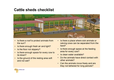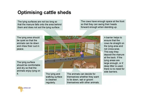 There are many different types of sheds/kraals or barns built from different materials. Basically, the following criteria can be used as a guide when building a new cattle shed or improving an existing one: