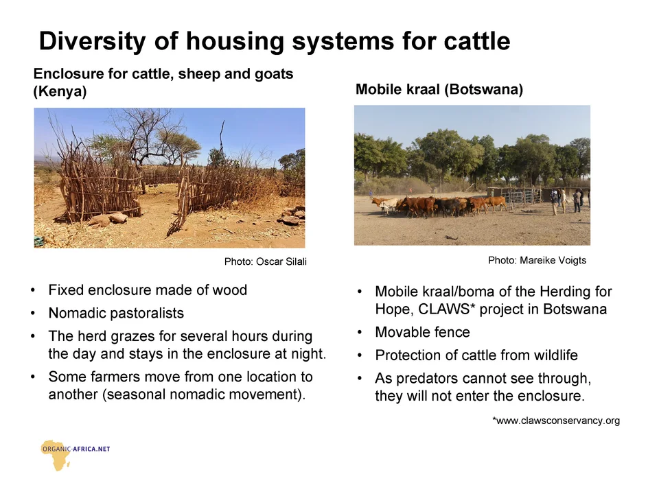 In an integrated crop-livestock farming system, farmers can control to a certain extent what and how much the animals eat, where dung and urine are deposited and how the manure is utilised. Keeping cattle in a fenced area grazing can allow the targeted grazing and trampling of grasses and bushes. This can increase the regrowth of plants. The periodic keeping of cattle in a cattle enclosure/kraal/boma (e.g. during the night) enables controlled feeding, watering, protection and monitoring of the animals and the collection of manure and its spreading on arable land, which promotes productivity. If kraals/bomas are mobile they can be moved over crop- or rangeland to improve soils and vegetation/crops, omitting the need for labour and the movement of manure. To prevent overuse of grazing land (implementation of planned grazing) kraals are used to confine animals and hold them close together at night to guide them to the respective grazing areas during the day.