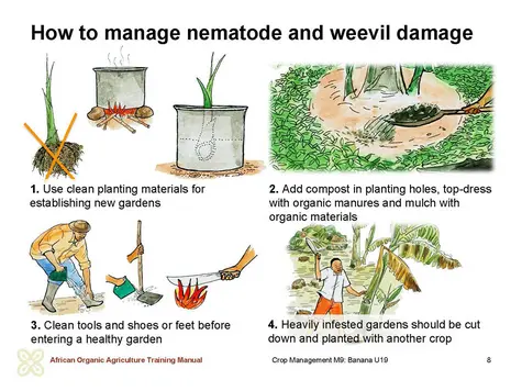 - Crop rotation - In heavily infested plantations, it is highly recommended to destroy the garden and remove all banana plants and their corms. Chop them to dry or compost them. Nematodes will survive in the soil for about one year if deprived of host materials. Therefore, after uprooting all banana material from the infected plot; grow other crops for a period for 1.5 to 2 years, followed by recultivation with clean banana planting materials.