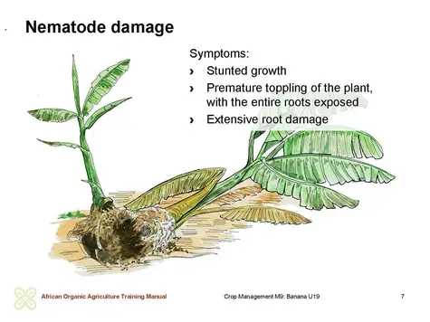 Radopholus similis and Pratylenchus goodeyi are the most damaging nematode species on bananas. Nematodes are microscopic (not visible with the naked eye) pests, which feed on banana roots. They destroy the roots and reduce uptake of water and nutrients. With damage to the roots, plants will lose stability and topple down. It is, however, hard for farmers to distinguish between damage caused by the nematodes and the banana weevils. Nematode attack will cause the plant to topple down with all the roots exposed (the whole plant is uprooted) while weevils will cause the plant to break from the base at the soil level. New fields become infested with nematodes when suckers from infected fields are used; nearly all suckers will be infected with nematodes in an infected field. Cooking bananas and plantains are particularly susceptible to nematodes.