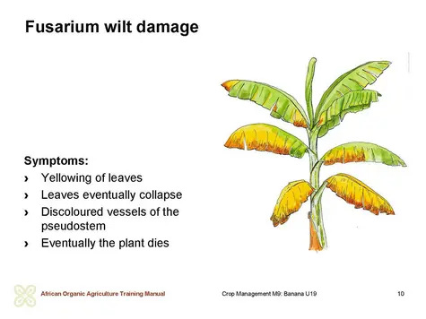 - Field hygiene - It is highly recommended to destroy infected gardens; remove all banana plants and their corms. Chop them to dry or compost them to limit the spread of infection. Plant the field with other non-susceptible banana cultivars (cooking bananas, Cavendish, or other hybrids). Select new clean fields for replanting with clean banana planting materials. Ensure that proper cleaning is done of all tools and farmers shoes/feet (dipping in a 10 % Sodium hypochlorite solution) before entering a healthy garden. Banana corms should not be shared between gardens to limit the spread of nematode infections.