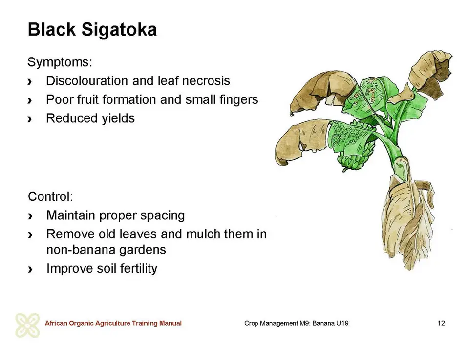 - Ensure field hygiene - Remove old leaves and mulch them in non-banana gardens to limit infecting young leaves and plants and banana leaves and stalks should not be shared between gardens to limit spread of infections.