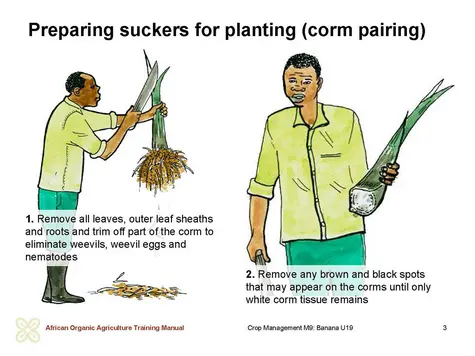 - Remove all leaves, outer leaf sheaths, roots, dead parts of the plant and pare the corm (trim off part of the corm) to eliminate weevils, weevil eggs and nematodes. Any brown and black spots that may appear on the corms should also be removed until only white corm tissue remains.