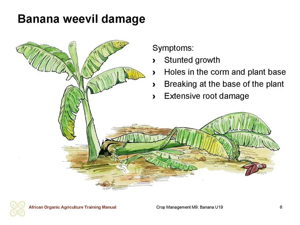 The Banana weevil is a very damaging banana root borer. The larvae bore into corms, suckers, and roots and lead to extensive root destruction. This leads to stunted plant growth and eventually premature toppling of the plants and plant death.