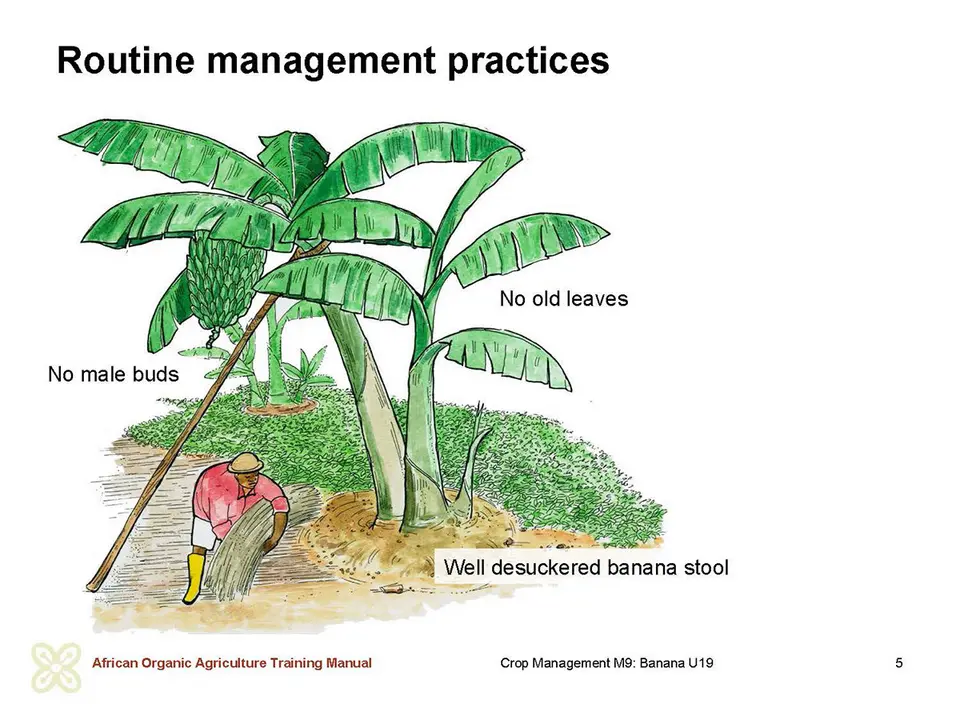 Some management practices are helpful in both strengthening the growing banana plants and in minimising the spread of pests and diseases. However, these practices need to be routinely applied together as a package because, leaving one practice may undermine the benefits achieved from the others.
