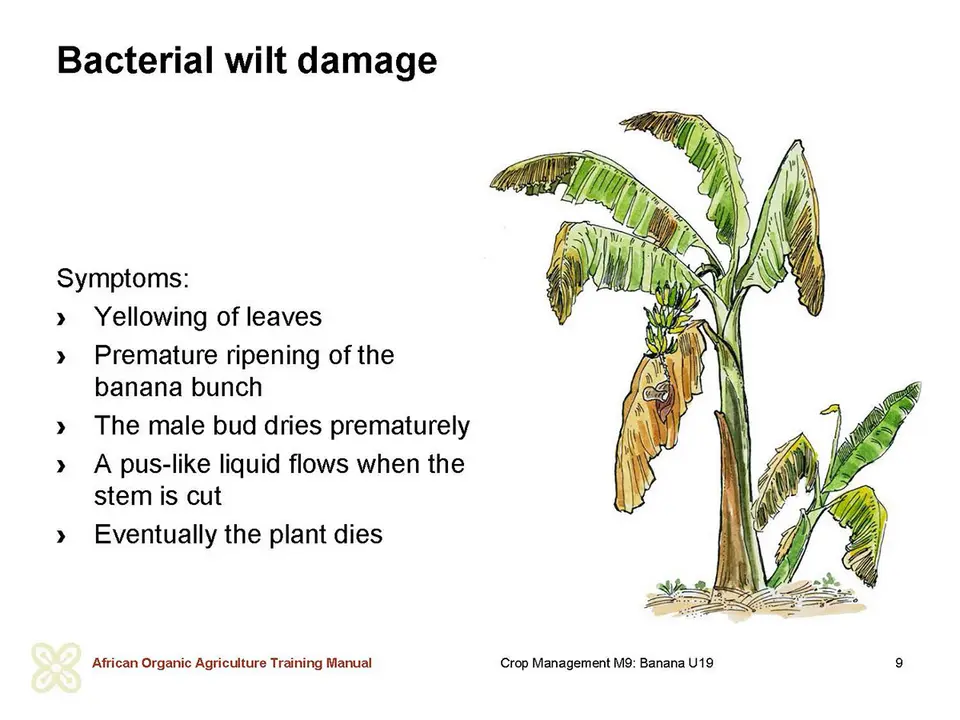 Bacterial wilt is the most destructive banana disease, attacking all types of bananas. It is caused by Xanthomonas campestris pv. Musacearum. Infected plants show premature ripening and staining of fruits, yellowing of leaves, the male bud dries prematurely and a pus-like liquid flows when the stem is cut. The infection is spread when farm tools and infected plant parts are moved from infected to healthy gardens. It is also spread by pollinating bees visiting male buds of infected plants and passing the infection to male buds of healthy plants.