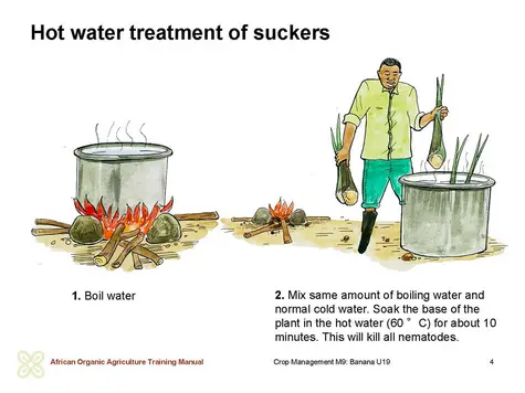 - It is recommended to treat the suckers in order to clean them of any infections. This is done by soaking the suckers in soapy water over night to eliminate weevil eggs and nymphs. Alternatively, the suckers can be treated by soaking the base of the plant in hot water (about 60 °C) for 10 minutes. This will kill all nematodes in the outer layers of the sucker. A 10 % household bleach solution (100 ml of solution in 1 litre of water) is also useful for disinfesting corms. Submerge the base of the suckers into the solution for about 20 minutes.