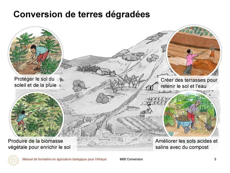 De nombreux essais montrent que l’agriculture biologique constitue une approche prometteuse pour l’amélioration de l’état de terres dégradées et pour leur remise en production. Le plus souvent, l’augmentation du taux de matière organique joue un rôle clé dans l’amélioration qualitative des sols dégradés.