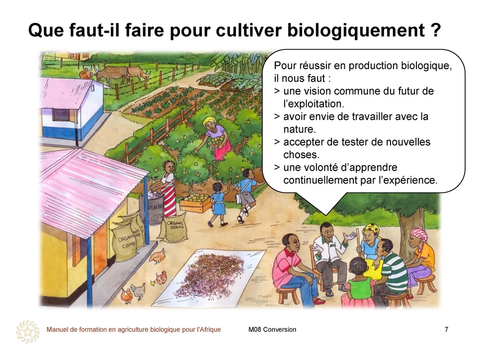 Sinon, avec les agriculteurs, caractérisez l'agriculture traditionnelle telle qu'elle est pratiquée dans le contexte local et comparez-la à celle de l'exploitation biologique. Discutez avec les agriculteurs des différences entre les deux images. Quels sont les défis et le potentiel qu'ils reconnaissent dans la conversion ? Visitez une ferme conventionnelle qui a été convertie à l'agriculture biologique, si possible. Laissez l'agricultrice partager son expérience de la conversion de la ferme. Quels sont les défis qu'elle a dû relever ? Quels avantages ont résulté de la conversion ? Quelles recommandations ferait-elle à d'autres agriculteurs conventionnels intéressés par la conversion ?