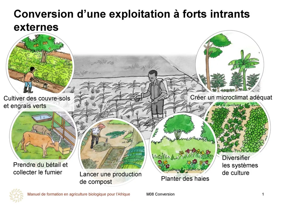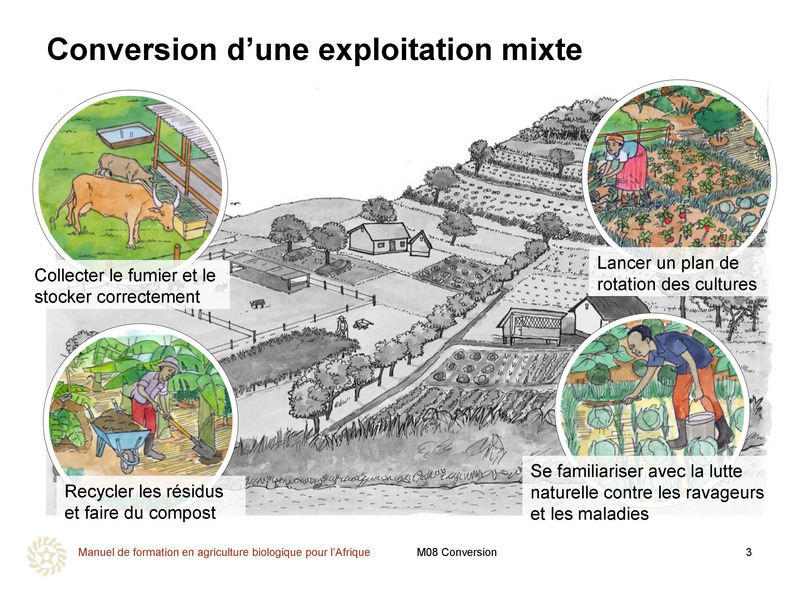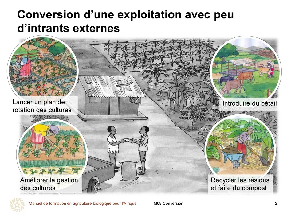 On parle de conversion à l’agriculture biologique pour désigner le processus d’apprentissage et de mise en œuvre de changements à apporter à l’exploitation afin de la rendre plus durable et plus proche de l’état naturel. Dans la pratique, ce processus dépend à la fois des données locales et des prédispositions de l’exploitant ou de la communauté concernée et varie donc d’une exploitation à l’autre. La conversion sera d’autant plus aisée que le paysan maîtrisera mieux les concepts et la pratique du bio, qu’il saura mettre à profit les ressources propres de l’exploitation ou d’autres ressources locales pour maintenir la fertilité des sols et pour endiguer les ravageurs et les maladies et que son exploitation sera déjà “biologique”. Même si le terrain qu’on entend convertir à l’agriculture biologique ne doit pas répondre à des exigences particulières, il est par exemple évident que la conversion d’un sol dégradé en un système de production durable et fournissant des récoltes satisfaisantes demandera davantage d’efforts et de patience.