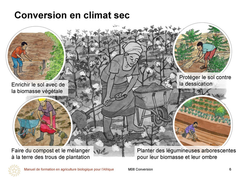 Il est plus difficile de convertir à l’agriculture biologique une exploitation située dans une région à précipitations faibles et températures élevées ou encore très venteuse qu’une ferme d’une région aux précipitations bien réparties et bénéficiant de températures favorables. En même temps, les améliorations résultant de l’adoption de pratiques culturales biologiques seront plus évidentes dans une zone aride que dans une zone où les précipitations sont idéales. Ainsi par exemple, le compost utilisé pour améliorer la couche de terre superficielle ou dans les trous de plantation en améliore la capacité de rétention d’eau, de même que la tolérance des plantes au manque d’eau.