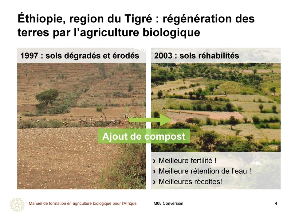 Quatre villages de la région éthiopienne du Tigré ont décidé en 1995 de remplacer les engrais de synthèse par du compost dans le but d’améliorer la fertilité des sols et la qualité des récoltes. En 12 ans, le gouvernement a étendu le projet et l’approche à 165 districts de cette région du pays. Les effets positifs du compost ont très vite été visibles, et il n’a fallu que 2 à 3 années pour que les fermiers n’utilisent plus que du compost. Cette technique a de manière générale doublé les rendements des cultures céréalières comparé aux parcelles sans compost et donnait même de meilleurs résultats que les engrais de synthèse. Grâce à l’amélioration de la fertilité du sol et de sa capacité de rétention d’eau, les paysans ont pu diversifier les cultures, améliorer la résilience de leurs fermes, mieux nourrir leurs familles et de créer de nouvelles sources de revenus.