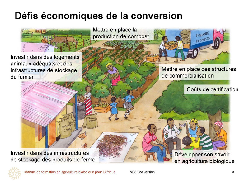 Les fermes traditionnelles fonctionnent déjà selon certains principes de l’agriculture biologique, en ne dépendant que des ressources locales, cultivant plusieurs espèces végétales simultanément et gérant plusieurs activités, élevage d’animaux de ferme inclus. Cette similarité avec la production bio est encore accentuée par le fait qu’elles n’utilisent que peu ou pas d’intrants synthétiques ni de plantes génétiquement modifiées. Toutefois, d’autres pratiques distinguent clairement ces exploitations des exploitations bio. La conversion devra relever les défis suivants : :