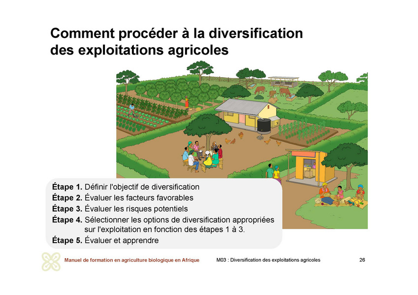 La décision de commencer ou d'améliorer le niveau ou l'étendue de la diversification sur une exploitation agricole dépend de nombreux facteurs. Ainsi, le processus de décision peut être considéré comme un processus par étapes comprenant cinq (5) étapes d'autoréflexion. L'accent est mis sur les régions tropicales et subtropicales où la plupart des petits exploitants vivent et survivent grâce aux systèmes de culture, d'élevage et d'agroforesterie qui sont les principales composantes des systèmes agricoles dans ces régions.