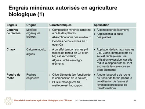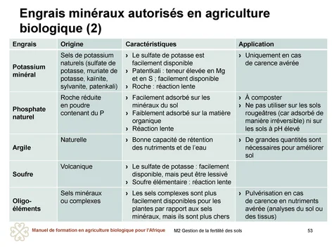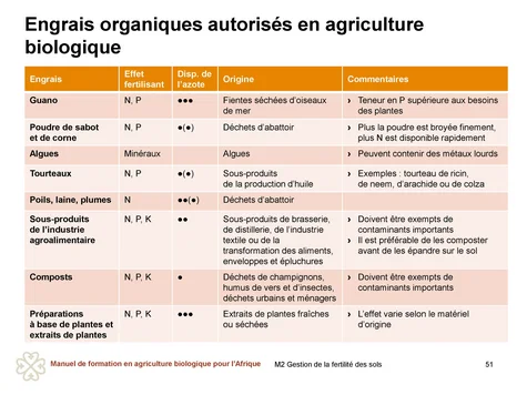 Les agricultrices et agriculteurs sont invité·es à consulter les agent·es de vulgarisation ou les agent·es de leur organisme de certification avant d’utiliser l’un de ces engrais, car les conditions spécifiques peuvent varier.