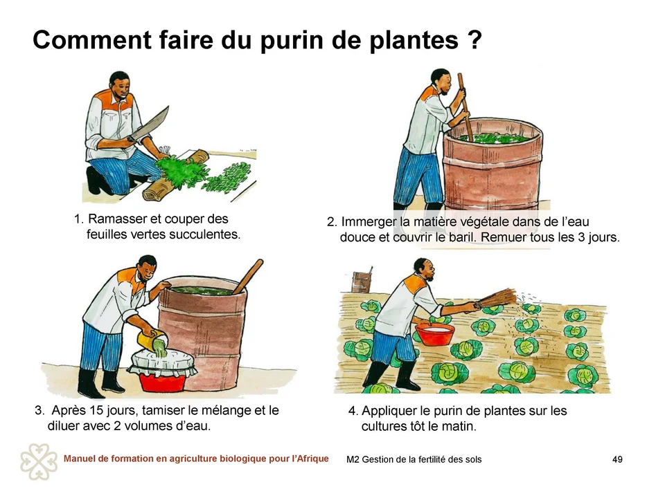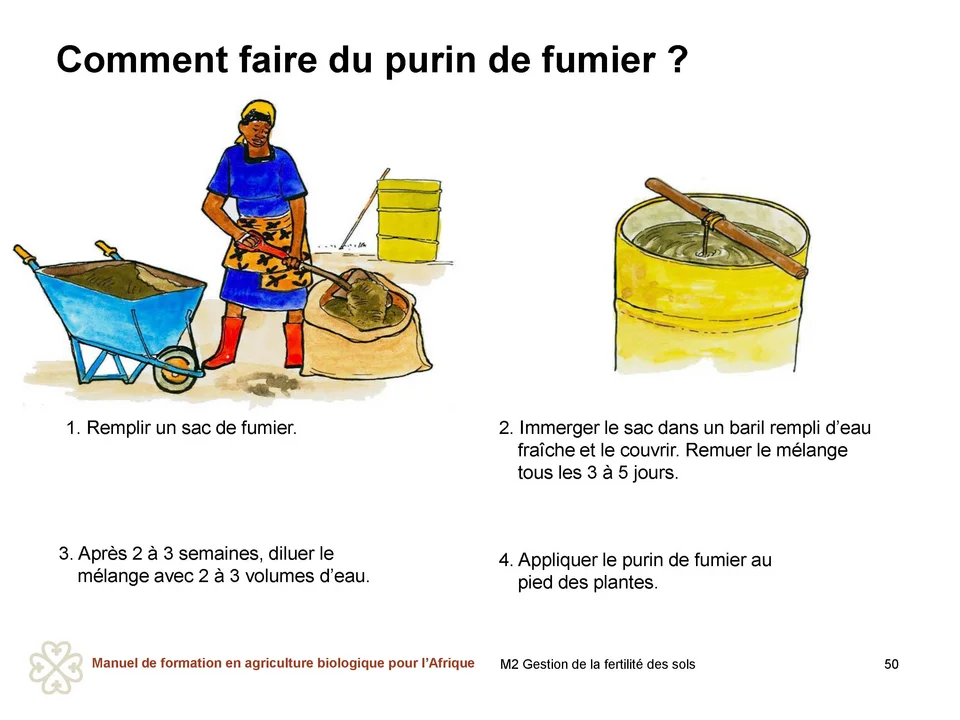 Pour faire du purin de fumier, on peut utiliser du fumier frais de bovins, de poules, de caprins, d’ovins, de lapins ou un mélange de tous ces fumiers. La procédure à suivre est la suivante : 1. Remplir un sac avec environ 50 kg de fumier et le fermer solidement à l’aide d’une corde. Accrocher le sac de fumier à une perche placée au-dessus d’un baril d’une capacité de 200 litres, de sorte qu’il soit suspendu dans le baril, puis remplir le baril d’eau. 2. RRecouvrir le baril d’un film en polyéthylène pour éviter que l’azote ne s’échappe et le laisser à l’abri de la lumière. 3. Remuer le mélange dans le baril tous les 3 à 5 jours en soulevant le sac plusieurs fois à l’aide de la perche pour le sortir partiellement de l’eau et l’immerger à nouveau. 4.Au bout de 2 à 3 semaines, l’eau sera devenue foncée et la plupart des nutriments auront été dissous dans l’eau. Plus la couleur est foncée, plus le mélange est concentré. Il est alors prêt à l’utilisation. Retirer du baril le sac contenant les restes de fumier. La solution aqueuse est prête à être diluée pour être appliquée. 5. Diluer le purin de fumier avec 2 volumes d’eau pour 1 volume de purin. Toutefois, si le purin de fumier est très concentré (très foncé), utiliser 3 volumes d’eau pour 1 volume de purin. 6.Appliquer le purin de fumier sur les cultures à raison de ¼ à ½ litre par plante en commençant 2 à 3 semaines après la plantation. Appliquer le purin de fumier autour de la tige et non sur les feuilles. Répéter l’application toutes les 3 à 4 semaines. Éviter l’application en plein soleil en raison du risque élevé de brûlures des feuilles et de pertes de nutriments. L’appliquer tôt le matin ou par temps nuageux.