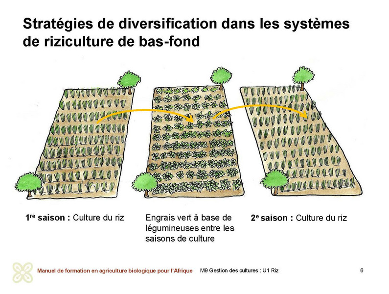 Dans une culture de riz d’une saison, la légumineuse peut être plantée après la récolte de la culture principale pour profiter de l’humidité restante du sol. On laisse la légumineuse (par exemple, le haricot mungo ou le mucuna) pousser jusqu’à maturité. Puis, au début de la saison des pluies, elle est enfouie dans le sol.