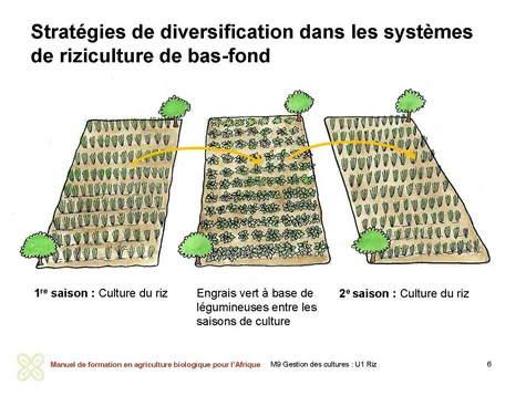 La mise en place de légumineuses ou d’engrais verts en rotation ou en culture intercalaire avec le riz améliore la fertilité du sol et empêche le développement de populations de ravageurs, de maladies et de mauvaises herbes. Les cultures de légumineuses (par exemple le niébé, le pois d’Angole, le haricot mungo et le soja) ou les cultures d’engrais verts (haricot sabre, arachide pérenne ou mucuna) fixent l’azote et produisent de grandes quantités de biomasse qui peuvent être utilisées pour augmenter la disponibilité de l’azote et la matière organique du sol.