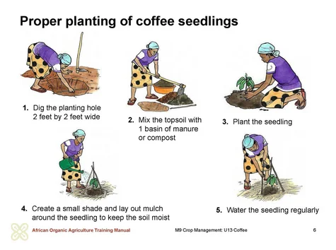 The coffee seedlings should be planted at the onset of the rainy season into holes, 2 feet by 2 feet large. Ideally the holes are filled with topsoil mixed with 1 bucket/basin of well-prepared manure or compost before planting. A small shade around each young plant protects it from drought stress. In the first year during the dry season the young coffee plants should be watered regularly. Ring mulching keeps the soil around the trees moist.