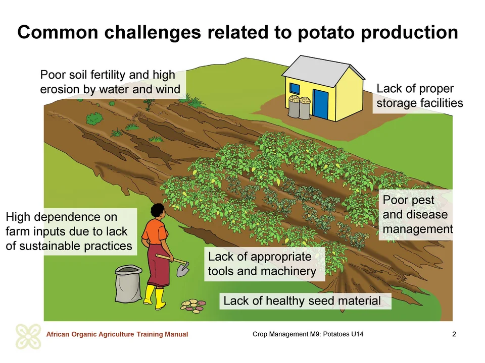 Average potato yields mostly are very low in Cameroon with 4 to 6 tons per ha (compared to a potential of 15 to 20 tons per ha) due to low soil fertility, using infested planting material, low use of farm inputs, and high disease and pest infection rates. Losses during storage, including losses in quality, are considerable. Due to low yields and high losses farmers cannot afford to invest into efficient farm inputs.