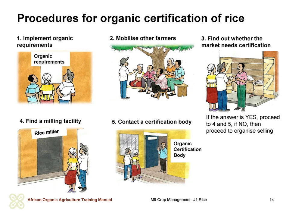 Organic certification of rice production is only reasonable if done as a market requirement, i.e. there should be a market that demands it. As the organic markets continue to grow in Africa both domestic and export markets, more rice producers will need to verify and approve their systems as organic. Thus certification is expected to increasingly become important.